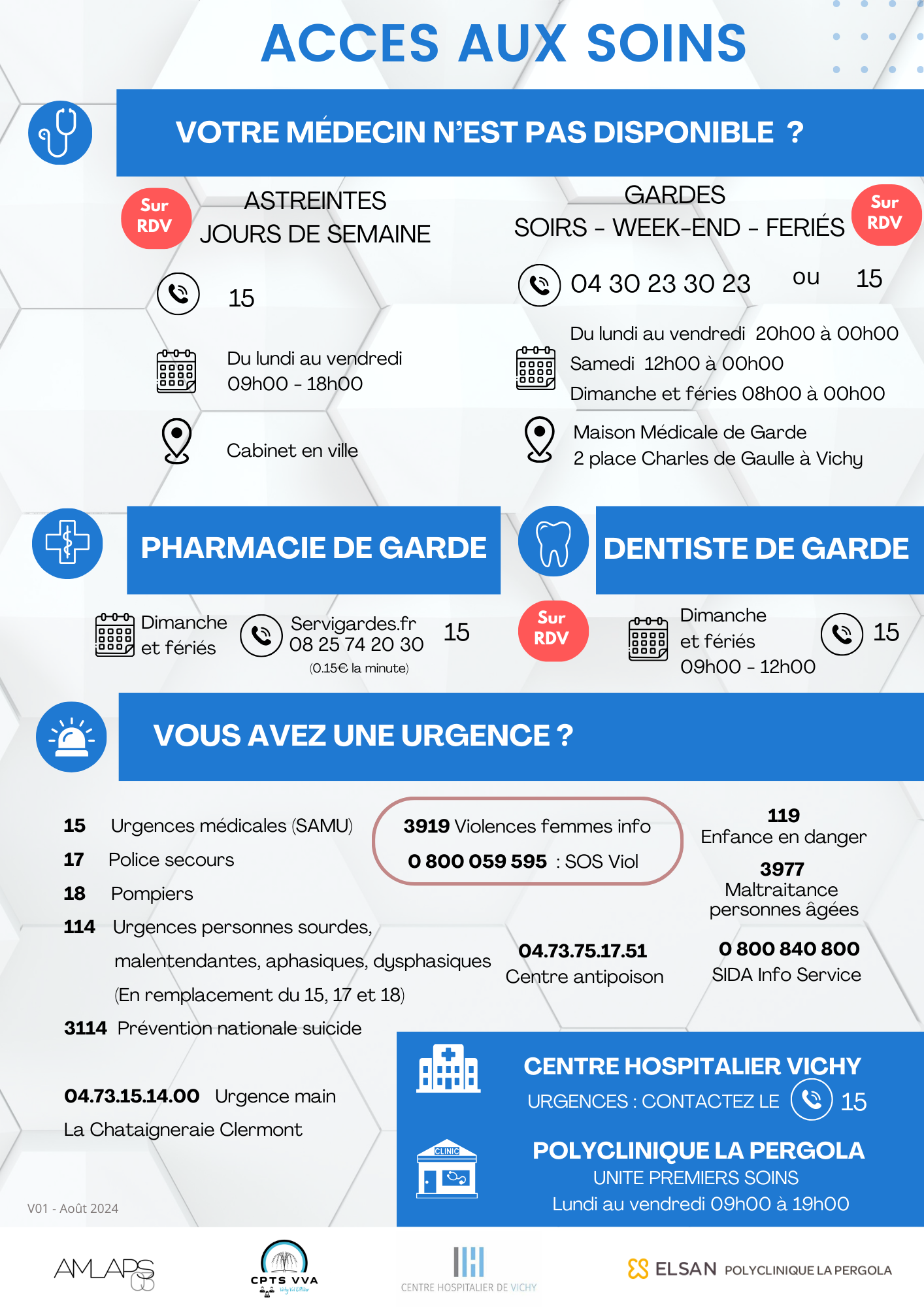 Retrouvez les différents accès aux soins non programmés et n° d'urgence sur le territoire de la CPTS Vichy Val d'Allier.